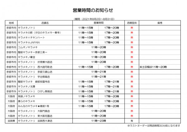 京都府・大阪府の要請を受け8月2日より営業時間が変更となります。