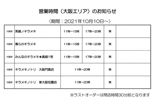 [キラメキNEWS]営業時間のご案内〈2021.10 大阪エリア〉